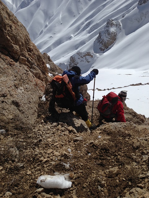 روی این یال صخرهای وجود دارد که نشانه یال صعود میباشد که عبور از آن تا حدودی دشوار است. بعد از این مسیر (دست به سنگ)، برای صبحانه توقف کردیم که در سمت شرق قلههای کاسونک و شیورکش خودنمایی میکردند. بعد از صبحانه، تیم پیشرو حرکت کرد و تیم اصلی هم با فاصله کمی آماده حرکت شد.