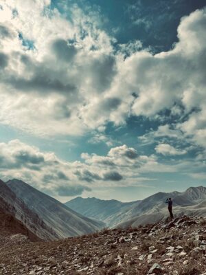 در این عکس فردی مابین آسمان و کوهستان چند قدم مانده به ابرها در فضایی کاملاً روحانی دیده میشود.