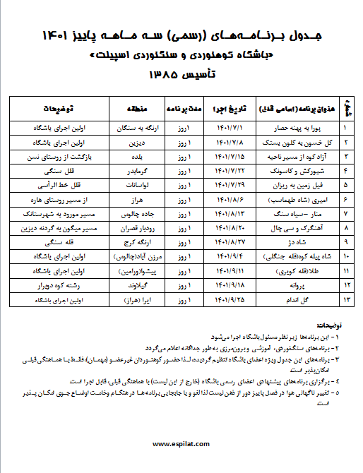 جـدول بـرنـامـههـای «رسمی» سـه مـاهـه پاییز 1401 «باشگاه کوهنوردی و سنگنوردی اسپيلت» تأسیس 1385
