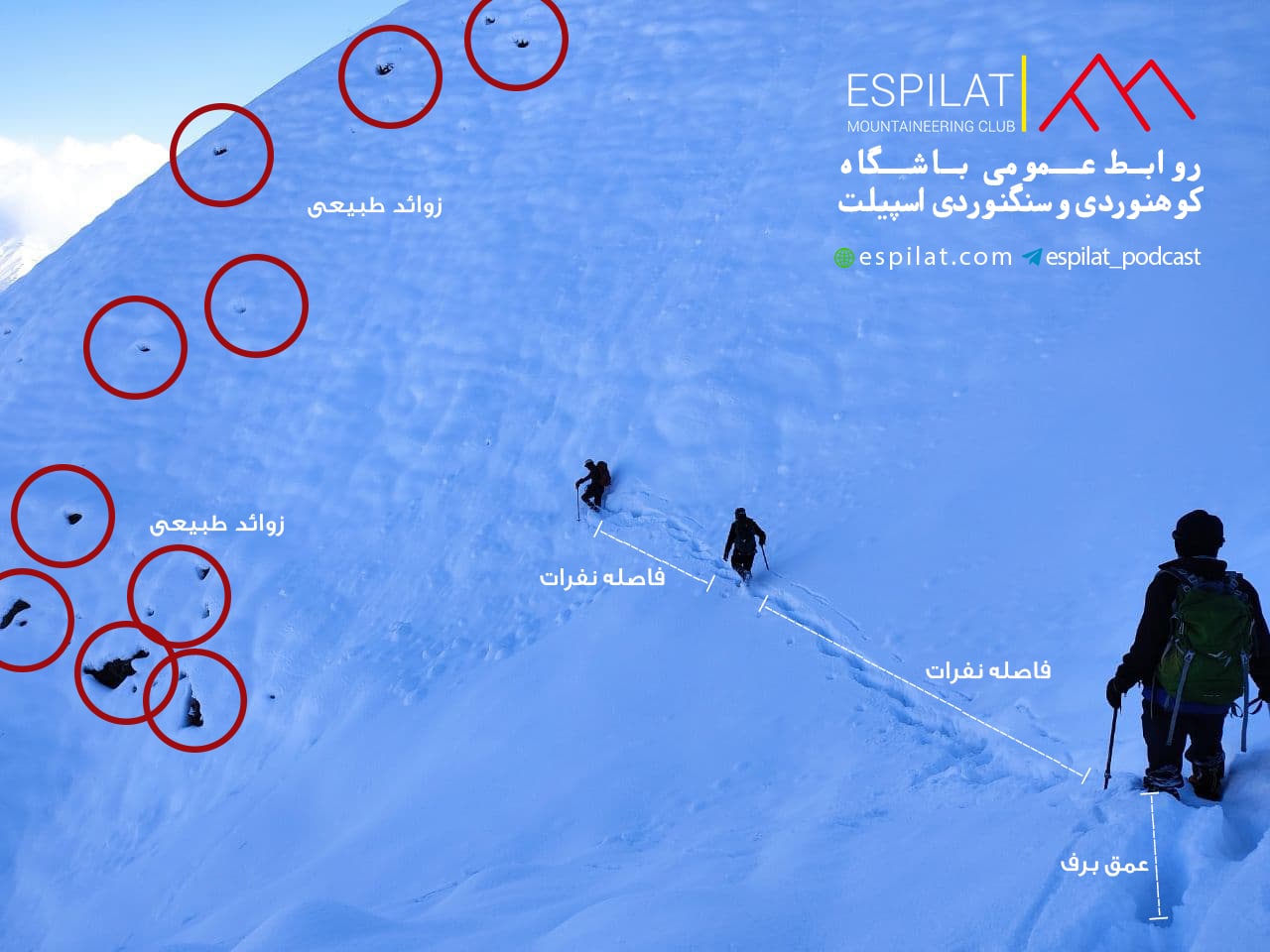 - با کمی دقت می توان در بالا و پایین دست نفر اول (ذبیح اله حمیدی) برآمدگی هایی را مشاهده کرد که نشان از سنگ هایی ست که در شیب وجود داشت و خطر بهمن را به صفر می رساند.