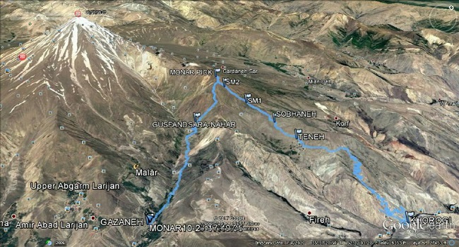نقشه مسیر صعود قله مُنار از طینه و بازگشت از گزانه