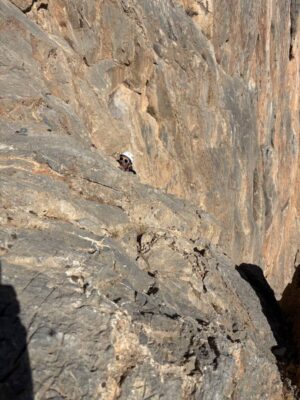 طول پنجم تقریبا کمی چالش داشت و حرکت های جالب و زیبایی داشت و قسمت نهایی آن به صورت گربه رو صعود میشود صعود کردیم، طول ششم داخل شکافی زیبا شروع میشود و پس از ۵ متری صعود به سمت راست تراورس میشد و پس از ۱۰ متر صعود کارگاه طول هفتم را میبینید،