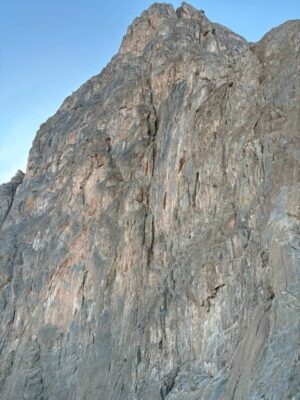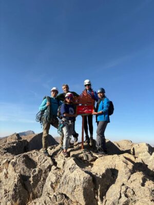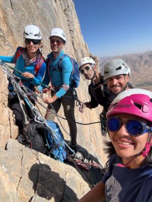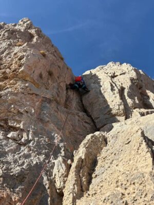 ساعت ۱۳ به این نقطه رسیدیم کمی به سمت چپ تراورس میکنیم و یک قسمت شکاف ۴ متری صعود میشود و دو طول بعدی که تقریبا دست به سنگ و کوهنوردی بود صعود کردم که البته ۱۰ متر آخر دارای دو رول است که باید دقت صعود شود را صعود کردیم و نهایتا ساعت ۱۵ همه نفرات به قله رسیدیم،
