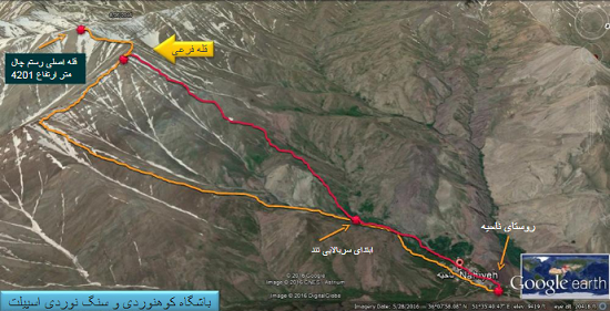 مختصات ابتدای مسیر حرکت (روستای ناحیه ) : 36 درجه , 09 دقیقه و 13.7 ثانیه (شمالی) و 51درجه , 36 دقیقه و 47.1 ثانیه (شرقی)