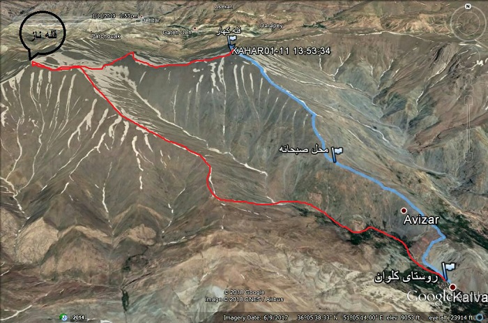 «قبل از رسیدن به قله دو نفر از اعضای تیم ناز ، آقایان رضا خلیل آبادی و علی شیدا را دیدیم که پس از عبور از بین دو قله ناز و کهار به تیم ما رسیدند.»