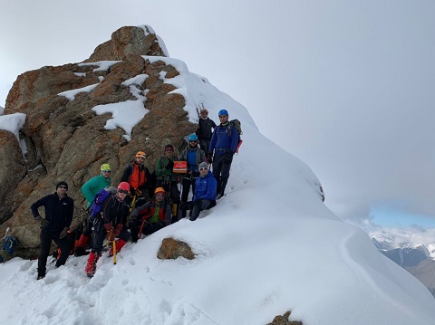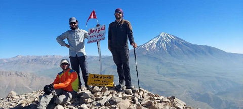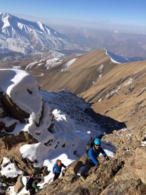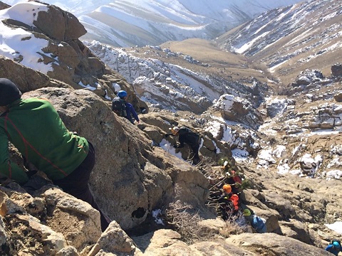 سپس در قسمت آخر دهلیز بعلت ریزشی بودن مسیر از طناب استفاده کردیم و با استفاده از یک بلوک طبیعی در سنگ کارگاهی ایجاد کرده و چند نفر از دوستان به صورت حمایت و بقیه با کمک یومار مسیر را صعود کردند و ادامه مسیر را روی دهلیز به سمت راست از مسیر کاملاً پوشیده شده از برف صعود کردیم. و تقریباً به انتهای خط الرأس قله رسیدیم و پس از 15 دقیقه به قله رسیدیم.
