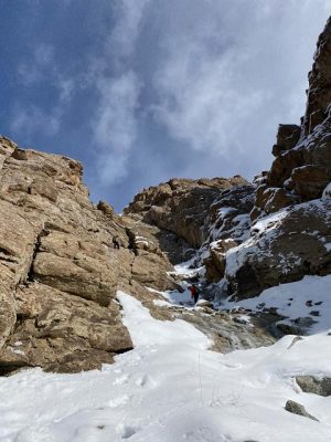 ابتدا از یال سمت راست دهلیز حدود دو طول دست به سنگ سبک داشتیم و پس از عبور از یک تراورس به دهلیز وارد شدیم داخل دهلیز برف کاملاً مسیر را لغزنده کرده بود.