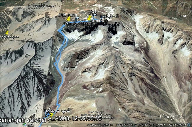 تیم اصلی پس از کمی استراحت به طرف قله سیاه سنگ ها حرکت کرد و پس از عبور مسیرهای(سیم بکسل) در ساعت 11:30 به جانپناه سیاه سنگ به ارتفاع 4580 متر رسید و پس از کمی استراحت به صعود ادامه داد و ساعت 13 به قله علم کوه دست یافت (ارتفاع 4850 متر).
